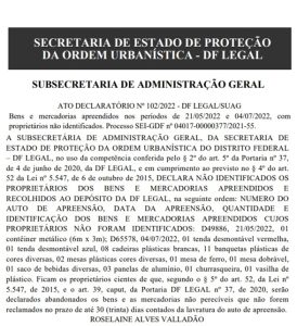 A SUBSECRETÁRIA DE ADMINISTRAÇÃO GERAL, DA SECRETARIA DE ESTADO DE PROTEÇÃO DA ORDEM URBANÍSTICA DO DISTRITO FEDERAL – DF LEGAL, no uso da competência conferida pelo § 2º do art. 5º da Portaria nº 37, de 4 de junho de 2020, da DF LEGAL, e em cumprimento ao previsto no § 4º do art. 52 da Lei nº 5.547, de 6 de outubro de 2015, DECLARA NÃO IDENTIFICADOS OS PROPRIETÁRIOS DOS BENS E MERCADORIAS APREENDIDOS E RECOLHIDOS AO DEPÓSITO DA DF LEGAL, na seguinte ordem: NUMERO DO AUTO DE APREENSÃO, DATA DA APREENSÃO, QUANTIDADE E IDENTIFICAÇÃO DOS BENS E MERCADORIAS APREENDIDOS CUJOS PROPRIETÁRIOS NÃO FORAM IDENTIFICADOS: D49886, 21/05/2022, 01 contêiner metálico (6m x 3m); D65578, 04/07/2022, 01 tenda desmontável vermelha, 01 tenda desmontável azul, 08 cadeiras plásticas brancas, 11 banquetas plásticas de cores diversas, 02 mesas plásticas cores diversas, 01 mesa de ferro, 01 mesa dobrável, 01 saco de bebidas diversas, 03 panelas de alumínio, 01 churrasqueira, 01 vasilha de plástico. Ficam os proprietários cientes de que, segundo o § 5º do art. 52, da Lei nº 5.547, de 2015, e o art. 39, caput, da Portaria DF LEGAL nº 37, de 2020, serão declarados abandonados os bens e as mercadorias não perecíveis que não forem reclamados no prazo de até 30 (trinta) dias contados da lavratura do auto de apreensão.