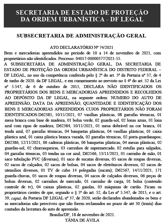 proprietários não identificados. Processo: 04017-00000377/2021-55. A SUBSECRETÁRIA DE ADMINISTRAÇÃO GERAL, DA SECRETARIA DE ESTADO DE PROTEÇÃO DA ORDEM URBANÍSTICA DO DISTRITO FEDERAL – DF LEGAL, no uso da competência conferida pelo § 2º do art. 5º da Portaria nº 37, de 4 de junho de 2020, da DF LEGAL, e em cumprimento ao previsto no § 4º do art. 52 da Lei nº 5.547, de 6 de outubro de 2015, DECLARA NÃO IDENTIFICADOS OS PROPRIETÁRIOS DOS BENS E MERCADORIAS APREENDIDOS E RECOLHIDOS AO DEPÓSITO DA DF LEGAL, na seguinte ordem: NUMERO DO AUTO DE APREENSÃO, DATA DA APREENSÃO, QUANTIDADE E IDENTIFICAÇÃO DOS BENS E MERCADORIAS APREENDIDOS CUJOS PROPRIETÁRIOS NÃO FORAM IDENTIFICADOS:D62385, 10/11/2021, 07 vasilhas plásticas, 08 garrafas térmicas, 01 mesa branca com base de madeira, 01 bolsa verde, 02 guarda-sol, 02 lonas azuis, 01 lona azul com ripas de madeira; D62384, 10/11/2021, 01 mesa dobrável na cor branca, 01 tenda azul, 07 garrafas térmicas, 04 banquetas plásticas, 04 vasilhas plásticas, 01 caixa plástica azul, 01 caixa plástica branca vazada, 02 garrafas térmicas, 02 porta-guardanapos;