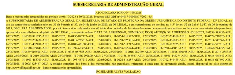 O DIRETOR DA DIRETORIA DE BENS APREENDIDOS DA SUBSECRETARIA DE ADMINISTRAÇÃO GERAL DA SECRETARIA DE ESTADO DE PROTEÇÃO DA ORDEM URBANÍSTICA DO DISTRITO FEDERAL – DF LEGAL TORNA PÚBLICA a relação completa dos bens e materiais apreendidos relativos ao Ato Declaratório nº 199, publicado no DODF nº 120, de 01 de Julho de 2025, pp. 74, na seguinte ordem: DATA DA APREENSÃO, NÚMERO DO AUTO DE APREENSÃO, QUANTIDADE E IDENTIFICAÇÃO DOS BENS E MERCADORIAS APREENDIDOS: 05/10/2023, F-0338-545953-AEU, 01 tenda; 10/05/2025, H-0579-911295-AEU, 05 garrafas para água, 01 cigarro, 01 caixa plástica, 02 bancos de plástico, 01 carrinho de carga, 10/05/2025, H-0436-892123-AEU, 24 garrafas de água mineral 500ml, 30 pipocas e salgados, 01 carrinho de supermercado, 01 caixa de isopor; 12/05/2025, H-0054-918527-OEU, 780 tijolos; 12/05/2025,H-0327-234260-AEU, 09 isqueiros, 08 latas de refrigerante, 06 latas de cervejas, 21 cadeados diversos, 17 cordões para crachá, 02 fones de ouvido, 07 pilhas, 25 doces diversos, 04 colas instantânea; 14/05/2025, H-0579-218326-AEU, 131 toucas, 62 meias diversas, 40 luvas de lã, 01 carrinho de carga; 12/05/2025, H-0327-233472-AEU, 107 roupas diversas, 23 acessórios para celular, 04 panelas diversas, 10 meias diversas, 94 calçados; 14/05/2025, H-0419-255613-AEU, 03 roupas diversas, 02 sacos de balas, 24 caixas de plástico, 02 esteiras de madeira, 03 bandeiras diversas, 02 caixas de isopor, 01 mesa de plástico, 01 cadeira de madeira, 01 carrinho de carga, 03 cabides, 01 cadeira de ferro/metal; 15/05/2025, H-0158-325381-AEU, 19 toucas, 10 luvas de lã; 15/05/2025, H-0186-336013-AEU, 01 portão de ferro/metal, 01 caixa d’água 500 L, 15/05/2025, H-2014-342662-AEU, 42 din-dins, 12 brinquedos diversos, 02 carrinhos de carga, 02 caixas térmicas; 16/05/2025, H-0173-432031-AEU, 02 banquetas de plástico, 02 caixas de isopor, 01 carrinho de açaí, 16/05/2025, H-0173-432031-AEU, 02 banquetas de plástico, 02 caixas de isopor, 01 carrinho de açaí, 01 acessórios diversos de informática, 08 garrafas de água mineral 500ml, 11 caixas de leite condensado, 01 leite em pó; 16/05/2025, H-0108-421600-OEU, 07 tintas para textura 18 lts, 02 mantas, 05 sacos de massa corrida, 01 massa drywall, 05 esmaltes sintético; 17/05/2025, H-0158-511712-AEU, 01 acessórios diversos para celular, 01 garrafa de água mineral 500ml, 01 saco de doces diversos; 17/05/2025, H-0158-512925-AEU, 03 carrinhos de supermercado, 01 saco de bebidas alcoólicas diversas; 17/05/2025, H-0338-527310-AEU, 19 bonés, 05 copos, 70 bijouterias, 06 braceletes plástico, 05 brinquedos diversos, 74 braceletes de pano; 19/05/2025, H-0338-679041-AEU, 13 engenhos publicitários; 19/05/2025, H-1997-683054-OEU, 1400 tijolos, 13 sacos de cimento; 20/05/2025, H-0059-765544-AEU, 01 puff, 03 raquetes mata mosquito, 01 saco de óculos diversos, 34 acessórios para celular, 89 bijuterias, 01 caixa de fruta, 01 cafeteira industrial, 03 sacos de roupas diversas, 01 saco de bolsas, 04 bonés, 06 brinquedos diversos, 02 malas, 01 saco de doces diversos, 01 caixa de isopor; 20/05/2025, H-0260-746061-FAU, 01 contêiner para lixo; 20/05/2025, H-0260-744955-FAU, 02 contêiner para lixo, 22/05/2025, H-0579-907590-AEU, 31 latas de cerveja, 01 bebida destilada, 01 caixa de isopor, 01 carrinho de carga; 24/05/2025, H-0338-057858-AEU, 117 cervejas long neck, 01 caixa de isopor; 26/05/2025, H-2016-289469-AEU, 15 Salgadinhos; 26/05/2025, H-2016-290198-AEU, 64 Salgadinhos, 02 doces diversos; 26/05/2025, H-2014-285338-AEU, 15 pipocas e salgados, 05 doces diversos; 26/05/2025, H-2019-269536-AEU, 09 toucas, 20 luvas, 72 meias diversas; 26/05/2025, H-0436-292800-AEU, 25 roupas diversas, 40 meias diversas, 01 vasilha de plástico, 01 colher de alumínio; 27/05/2025, H-0158-356937-AEU, 03 carcaças de tenda, 02 banquetas de plástico, 03 carretéis de bobina, 28/05/2025, H-0591-445274-AEU, 02 caixas de água, 03 cadeiras de plástico, 02 mesas de plástico, 01 armário de madeira, 02 tendas, 01 panela diversa, 03 caixas de isopor, 01 botijão de gás, 07 garrafas de água mineral 500ml, 10 latas de refrigerante; 28/05/2025, H-0436-445642-AEU, 50 kg de frutas, 01 máquina de cartão de crédito, 01 carrinho de mão; 28/05/2025, H-1993-455709-AEU, 01 carrinho de carga, 01 tableiro de madeira, 100kg de frutas; 28/05/2025, H-1993-467217-AEU, 65 roupas íntimas, 02 blusas diversas, 01 bolsa, 12 luvas de lã, 11 toucas, 244 meias diversas, 01 bebida destiladas; 29/05/2025, H-0026-516287-AEU, 01 banco de plástico, 01 caixa de isopor, 11 bebidas destiladas; 29/05/2025, H-0792-549479-AEU, 06 sacos de frutas, 01 tabuleiro de madeira; 30/05/2025, H-0436-617699-AEU, 16 cocos, 01 caixa de isopor, 01 banqueta de plástico, 12 garrafas de água mineral 500ml, 02 latas de refrigerante; 30/05/2025, H-2005-625467-OEU, 120 rolos de fio de energia, 01 bomba de água.