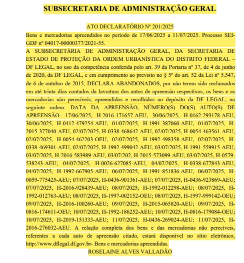 O DIRETOR DA DIRETORIA DE BENS APREENDIDOS DA SUBSECRETARIA DE ADMINISTRAÇÃO GERAL DA SECRETARIA DE ESTADO DE PROTEÇÃO DA ORDEM URBANÍSTICA DO DISTRITO FEDERAL - DF LEGAL TORNA PÚBLICA a relação completa dos bens e materiais apreendidos relativos ao Ato Declaratório nº 201, publicado no DODF nº 152, de 14 de Agosto de 2025, pp. 18, na seguinte ordem: DATA DA APREENSÃO, NÚMERO DO AUTO DE APREENSÃO, QUANTIDADE E IDENTIFICAÇÃO DOS BENS E MERCADORIAS APREENDIDOS: 17/06/2025, H-2016-171657-AEU, 39 acessórios para celular, 02 sacos de roupas, 02 sacos de pães, 02 carrinho de supermercado, 04 cesto de plástico; 30/06/2025, H-0162-2931778-AEU, 01 carrinho de carga, 01 caixa térmica, 12 garrafas de água mineral, 03 latas de refrigerante, 01 saco de roupa, 02 caixas de plástico, 19 bebidas destiladas, 01 cadeira de ferro/metal, 02 facas diversas, 02 alicates, 01 tesoura, 11 salgadinhos; 30/06/2025, H-0412-479254-OEU, 62 telhas de zinco; 01/07/2025, H-1991-387060-AEU, 01 saco de doces diversos; 01/07/2025, H-2015-377040-AEU, 02 roupas diversas, 02 bustos de manequim, 12 luvas de lã, 08 toucas; 02/07/2025, H-0338-468642-AEU, 01 carrinho de carga, 03 caixas de isopor, 01 banco de madeira, 01 saco de água mineral 500ml, 06 bebidas destiladas, 14 latas de cerveja, 10 latas de refrigerante, 03 garrafas térmicas diversas, 02 bacias de plástico; 02/07/2025, H-0054-463561-OEU, 708 Cerâmicas, 03 baldes de vedacit, 12 sacos de conexões diversas, 01 máquina lava jato, 02 sacos de tomadas diversas, 01 saco de disjuntores, 01 saco de caixa passa fio, 01 extensão, 08 massas acrílicas, 05 sacos de disjuntores, 04 tampas ara caixa de disjuntores, 01 lixadeira, 01 nível de mão, 01 rolo de fio, 02 sacos de prego, 04 rolos p/ banheiro/cozinha, 08 baldes de plástico, 08 massas plásticas, 03 cubas de pia; 02/07/2025, H-0054-462203-OEU, 02 motores, 03 sacos de fios elétricos; 18 venezianas/janelas, 16 ferramentas, 01 riscador de cerâmica, 01 lona geral, 01 mangueira, 04 mangueiras, 04 mangueiras para fios elétricos, 71 perfis, 5 nichos, 16 massas corridas, 10 bancadas gerais, 55 soleiras, 01 tinta, 20 sacos de argamassa, 30 barras de ferro, 02 tubos de PVC 100mm, 07 tubos de PVC 40mm, 04 tubos de PVC 50mm, 02 tubos de PVC 150mm, 3m areia lavada m³; 02/07/2025, H-1992-498358-AEU, 109 pipocas e salgados; 02/07/2025, H-0338-469301-AEU, 01 carrinho de supermercado, 01 caixa plástica, 02 sacos de conexões diversas, 01 saco de eletroeletrônicos; 02/07/2025, H-1992-499042-AEU, 06 blusas diversas, 21 bermudas; 03/07/2025, H-1991-559915-AEU, 02 sacos de pipocas e salgados; 03/07/2025, H-2016-583989-AEU, 01 saco de pipocas e salgados, 29 latas de cerveja, 01 caixa de isopor, 01 carrinho de carga, 02 bebidas destiladas, 02 roupas diversas; 03/07/2025, H-2015-573099-AEU, 02 caixas térmicas, 01 base de mesa retrátil, 01 cadeira de ferro/metal, 04 tendas, 50 alimentos perecíveis; 03/07/2025, H-0579-538243-AEU, 54 roupas diversas; 04/07/2025, H-0026-627085-AEU, 45 roupas diversas, 01 carrinho de carga, 01 caixa de plástico; 04/07/2025, H-0338-677843-AEU, 14 bebidas destiladas, 15 energéticos, 23 latas de cerveja, 16 garrafas de água mineral 500ml, 06 caixas térmicas, 01 tábua de carne, 01 saco de frutas, 01 mesa de madeira, 01 carrinho de carga; 04/07/2025, 1992-667905-AEU, 126 pipocas e salgados; 06/07/2025, H-1991-851836-AEU, 24 garrafas de long neck, 21 garrafas de bebidas destiladas; 06/07/2025, H-0059-775425-AEU, 03 feijões, 13 alimentos perecíveis, 03 bebidas destiladas; 07/07/2025, H-0436-901361-AEU, 14 garrafas de água mineral 500ml, 01 caixa de isopor, 02 carrinhos de supermercado, 01 carrinho de carga; 07/07/2025, H-0436-923869-AEU, 26 garrafas de água mineral 500ml, 07 latas de refrigerante, 52 salgadinhos, 03 pacotes de doces diversa, 02 carrinho de carga, 01 caixa de isopor, 01 caixa térmica, 01 cesto plástico; 07/07/2025 H-2016-928439-AEU, 01 saco de pipocas e salgados, 08 garrafas de água mineral 500ml, 02 caçulinhas de refrigerante, 08 doces diversos; 08/07/2025, H-1992-012298-AEU, 27 latas de cerveja, 08 latas de refrigerante, 04 energéticos, 04 bebidas alcoólicas diversas, 04 cigarros, 01 doce diverso, 01 caixa de isopor, 03 garrafas de água mineral 500ml, 01 carrinho carga; 08/07/2025, H-1992-012763-AEU, 14 pipocas e salgados, 36 doces diversos, 22 cabos diversos, 27 cordões para crachá, 05 carregadores para celular, 05 fones de ouvido, 02 cadeados diversos, 04 carteiras, 03 pacotes de pilhas, 01 isqueiro, 11 colas diversas; 08/07/2025, H-1997-002152-OEU, 22 colunas de ferro para construção, 20 treliças de ferro, 17 ferros, 01 betoneira, 06 cerâmicas, 02 cimentos, 01 guincho elétrico, 02 tubos de PVC 100mm; 08/07/2025, H-1997-999142-OEU, 230 tijolos furados, 07 sacos de argamassa, 56 cerâmicas, 02 carrinhos de mão, 02 mantas, 02 mangueiras para fios elétricos, 01 massa corrida, 01 guincho elétrico, 03 ferramentas diversas, 02 sacos de conexões diversas, 02 telas plásticas, 01 lata de tinta, 01 tesoura, 03 tubos de PVC 100mm, 01 tubo de PVC 75mm; 09/07/2025, H-2016-100260-AEU, 08 doces diversos, 09/07/2025, H-2015-065820-AEU, 05 sacos de pipocas e salgados; 09/07/2025, H-0816-176611-OEU, 11 cimentos; 10/07/2025, H-1992-186252-AEU, 89 prendedores de cabelo, 105 prendedores de cabelo; 10/07/2025, H-0816-179084-OEU, 01 caixa d’água tipo taça, 01 grade de ferro, 01 poste padrão, 03 luminárias de poste, 01 suporte para luminária, 03 bombas de água, 01 moto serra, 01 rocadeira, 29 rolos de fio de energia; 10/07/2025, H-2019-151333-AEU, 18 banquetas, 203 latas de cerveja, 03 long necks, 22 bebidas destiladas, 01 carrinho de carga, 02 carrinhos de churasco, 20 latas de refrigerante, 12 sucos de garrafa, 07 energéticos, 16 garrafas de água mineral 500ml, 01 máquina de cartão, 01 caixa térmica, 03 vasilhas de plástico, 03 porta guardanapo, 02 carvões, 01 farinha, 12 garrafinhas de refrigerante; 11/07/2025, H-0436-269024-AEU, 15 garrafas de